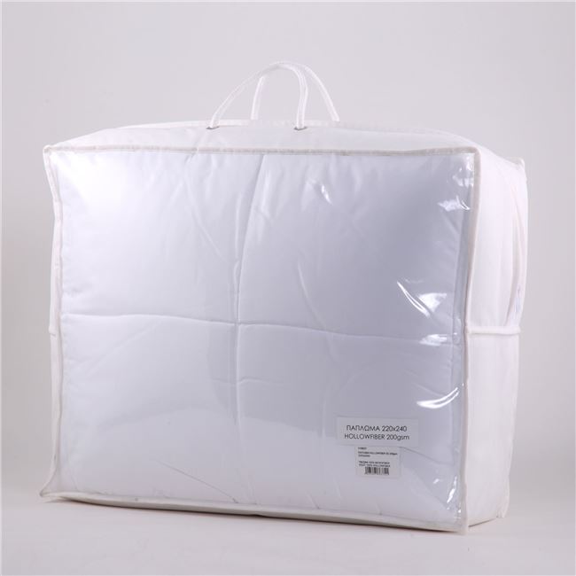 Πάπλωμα με ύφασμα 100% Πολυεστέρα 210 κλωστών. Γέμισμα με Πολυεστερική ίνα Hollowfiber. Καπιτονάρισμα ανά 25εκ. Κατάλληλο για κλιματιζόμενα δωμάτια καθ’ όλη τη διάρκεια του έτους. 4,5 Togs